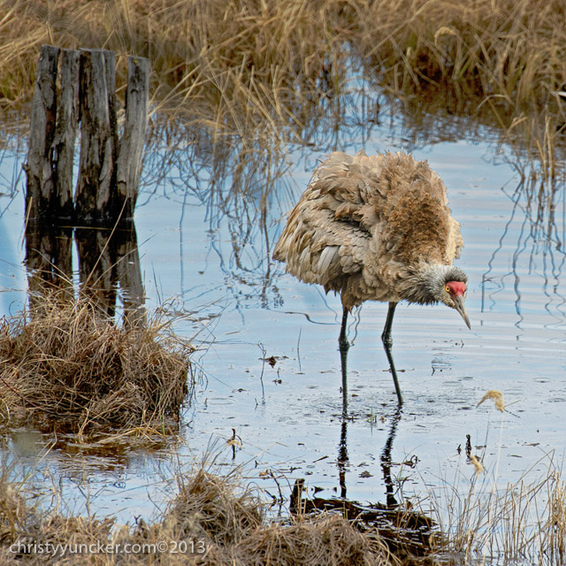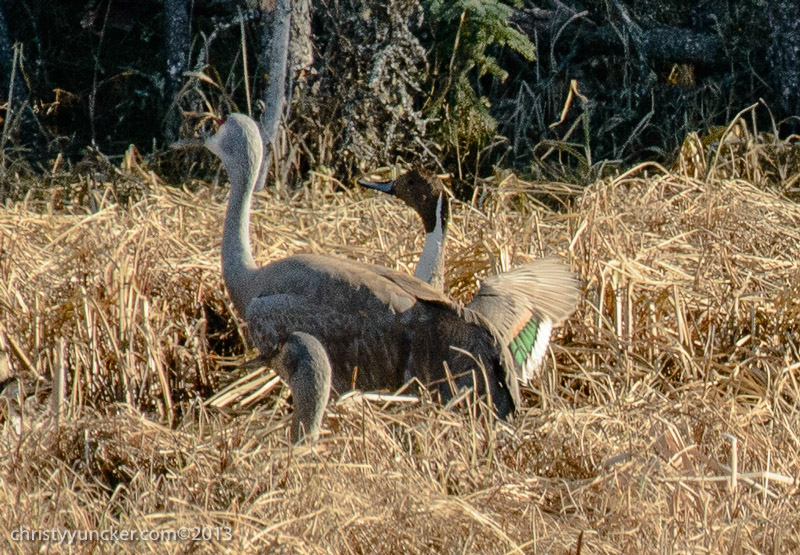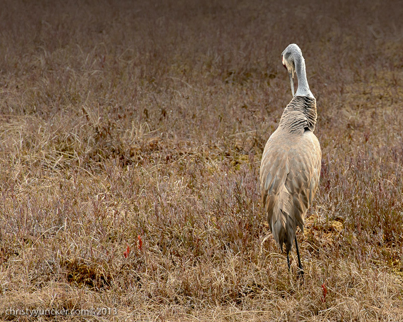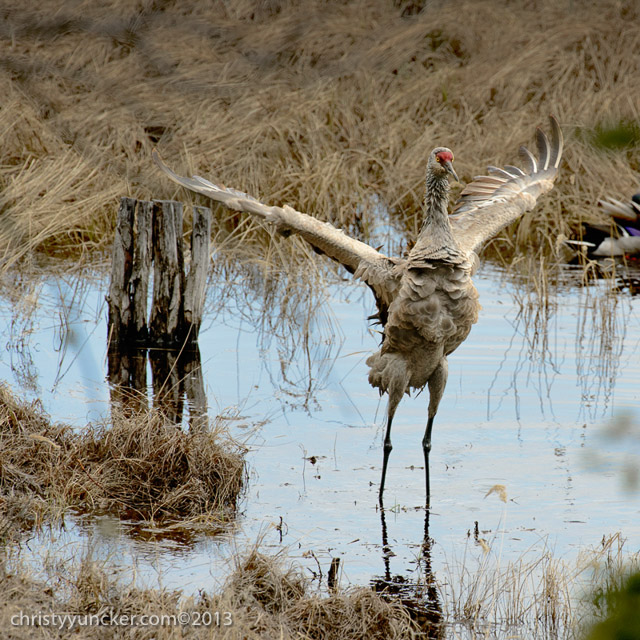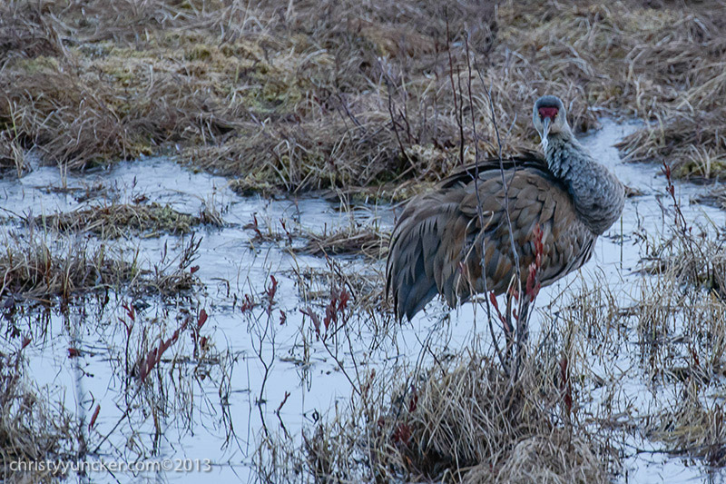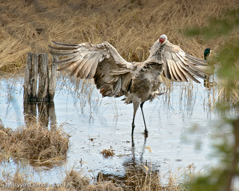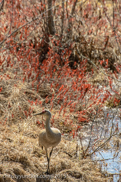 Both cranes feather paint during this time and wander their territory while the snow and ice melt.