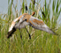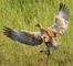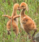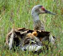 - Caution - In their first weeks, colts are especially vulnerable. The parents are particularly wary when ravens, northern harriers, or mew gulls are nearby. Whenever a predator is detected, colts crouch down in the grass, often under their mother. If the predator approaches, the parents defend vigorously, as seen in the left photograph which shows Millie shielding the colts (Jacques-09 and Phyl-09) and Roy Bill-stabbing at a mew gull. The mew gulls had nested within 30 meters of the crane nest. By midsummer, their gull chicks had become colt food and the adult gulls deserted the pond.